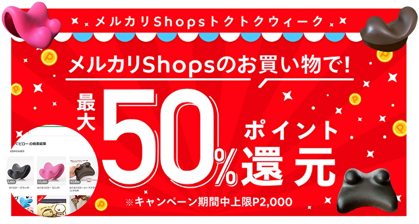 ・キャンペーン期間中にエントリーを行い、メルカリShopsで購入&購入ショップをフォローすると、抽選で対象購入額の最大50%ポイントを還元(上限P2,000)